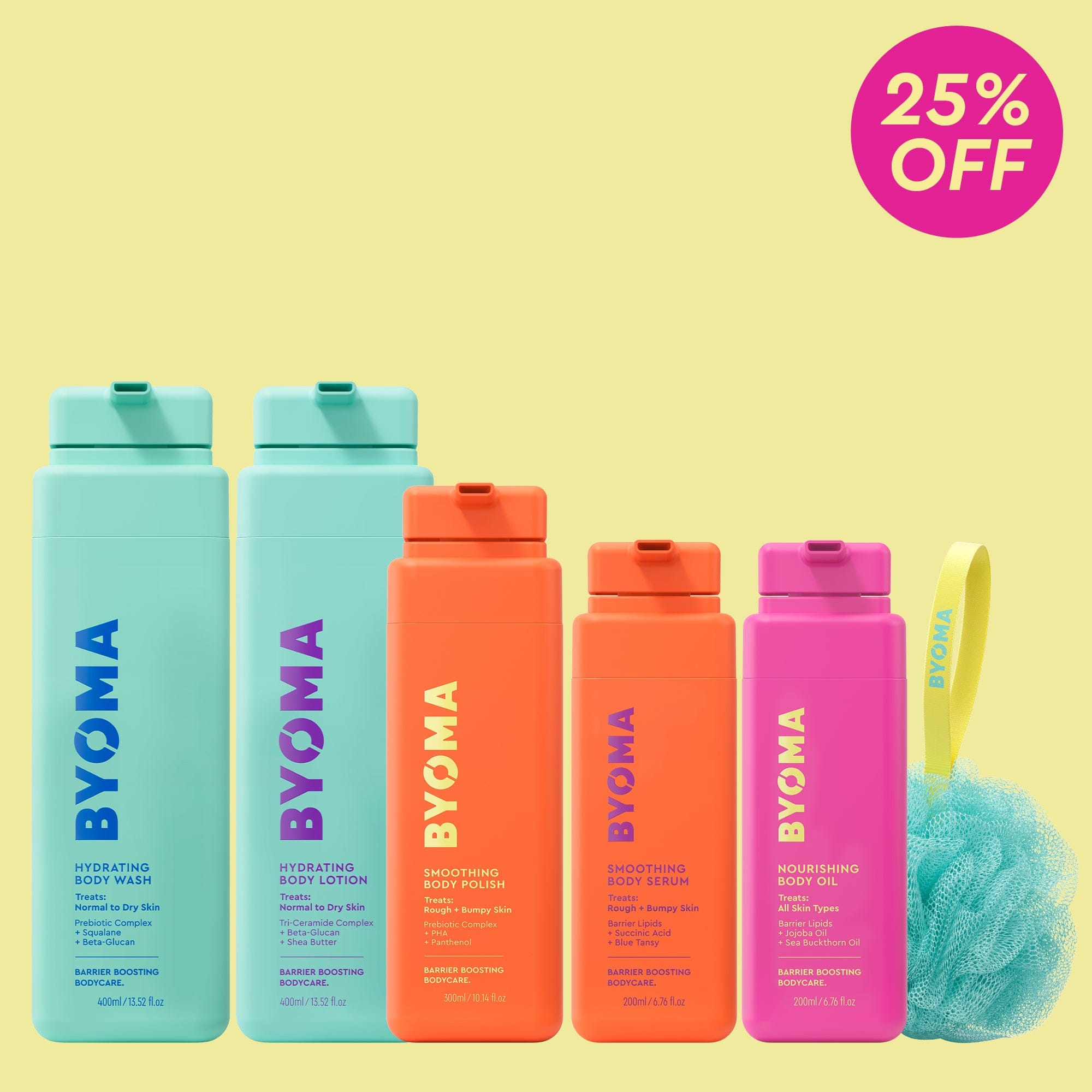 Meet your ultimate body care routine for smoother skin clinically proven hydration & your favourite BYOMA barrier boosting benefits. below the neck